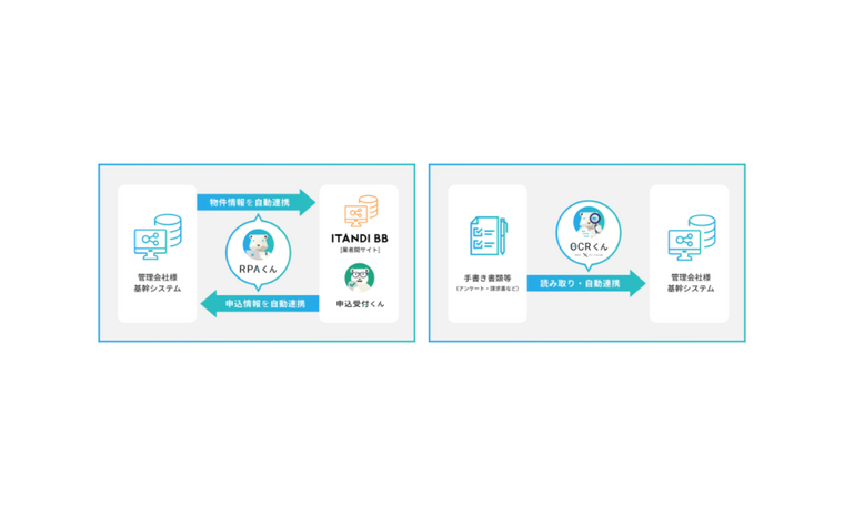 当社のグループ会社である、テクノロジーで不動産の賃貸取引をなめらかにするイタンジ株式会社(本社:東京都港区、代表取締役:野口 真平、以下「イタンジ」)は、不動産リーシング業務をワンストップでサポートする物件確認不要(※1)のリアルタイム不動産業者間サイト「ITANDI BB(イタンジ ビービー)」シリーズとして、不動産関連業務の自動化システム「RPAくん」 、及び手書き書類等のデータ化システム「OCRくん with AI inside」(URL:https://bukkakun.com/cloud_chintai/rpakun/lp) 」の提供を開始します。