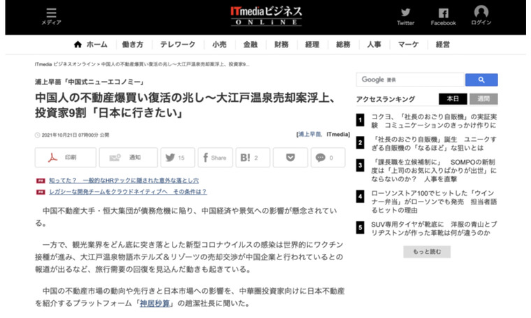 ITmediaビジネスオンラインにて、当社のグループ会社である株式会社神居秒算の代表取締役社長 趙 潔の 「中国の不動産市場の動向や先行きと日本市場への影響」についてのインタビューを掲載していただきました。