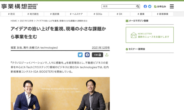 PROJECT DESIGNの月刊「事業構想」12月号にて、当社の社内新規事業コンテスト「GA BOOSTER」をテーマに、執行役員(投資戦略担当) 福冨 友哉とGlobal Business/住まいアドバイザー本部長 溝内 良輔のインタビューを掲載いただきました。