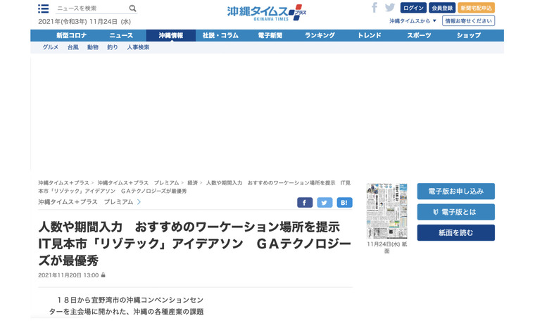 沖縄タイムスにて、11月18日から宜野湾市の沖縄コンベンションセンターを主会場に開かれた、沖縄の各種産業の課題解決策を提案するIT見本市「リゾテックエキスポ2021」にて、当社の執行役員 CCO 川村 佳央・AISC部長 福中 公輔・Bramson Aaronが参加し、最優秀賞を受賞したことについてご紹介いただきました。