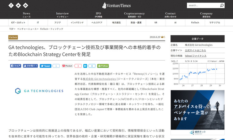 『GA technologies、ブロックチェーン技術及び事業開発への本格的着手のためBlockchain Strategy Centerを発足』
