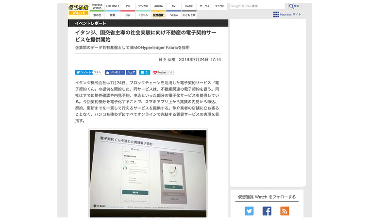【掲載情報】仮想通貨Watch(2019.07.24)『イタンジ、国交省主導の社会実験に向け不動産の電子契約サービスを提供開始』