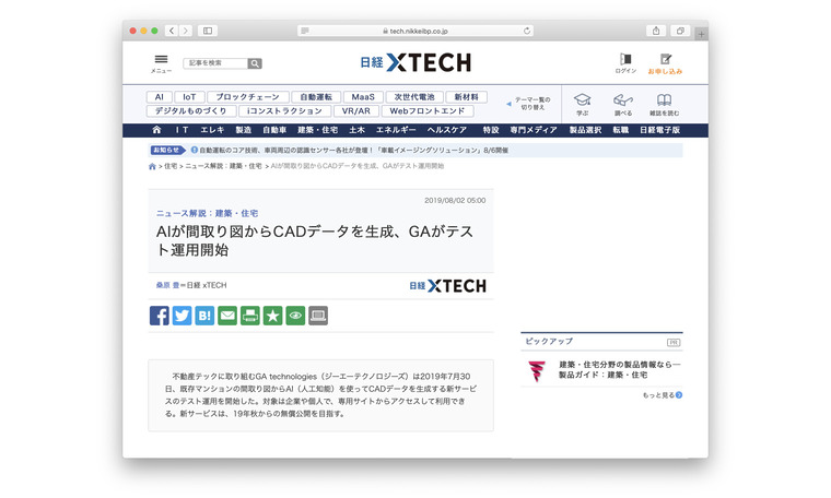 日経 X TECHにて、既存マンションの間取り図からAI(人工知能)を使ってCADデータを生成する「BLUEPRINT by RENOSY(ブループリント バイ リノシー)」をご紹介いただきました。