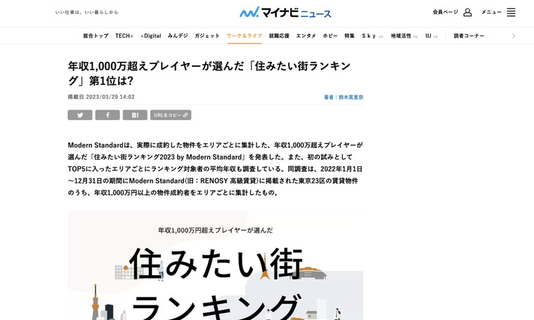マイナビニュースにて、年収1,000万円超えプレイヤーが選んだ「住みたい街ランキング2023 by Modern Standard」をご紹介いただきました。
