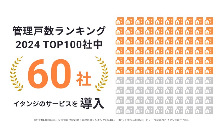 当社のグループ会社である、テクノロジーで不動産取引をなめらかにするイタンジ株式会社(以下「イタンジ」)は、2024年10月、全国賃貸住宅新聞社が毎夏発表する全国賃貸不動産管理会社の「管理戸数ランキング」(※1)トップ100社中60社に、イタンジが提供する賃貸不動産業務支援システムを導入したことをお知らせします。