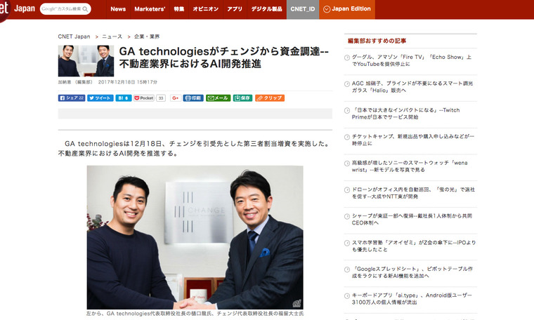12月18日のCNET Japanにて、チェンジ社からの資金調達、及びAIを利用した事業開発の取り組みについて、ご紹介ただきました。