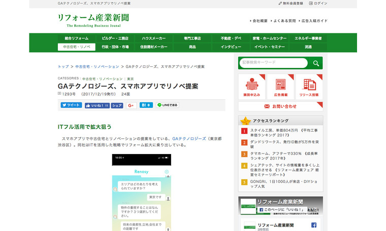 12月19日発売のリフォーム産業新聞にて、当社のリノベーションアプリとオンラインショールームをご紹介いただきました。来年は更にリノベーション事業も加速させます。