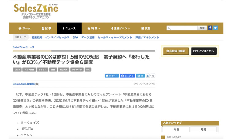 SalesZineにて、当社のグループ会社であるイタンジ株式会社も参画した、不動産テック7社1団体の共同調査について取り上げていただきました。