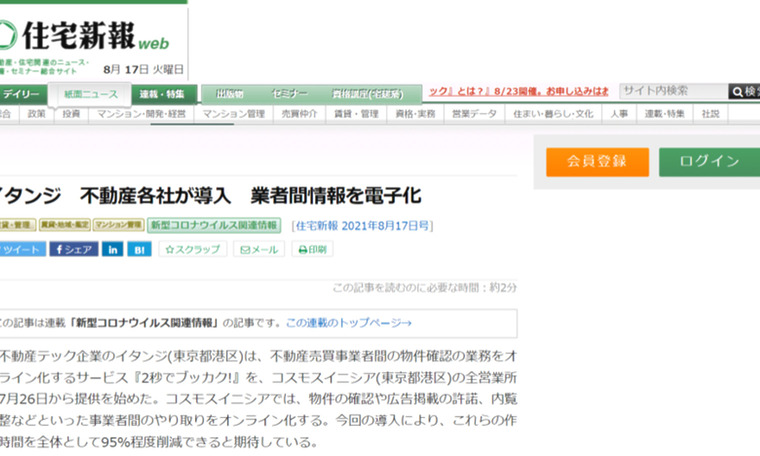 住宅新報にて、 当社のグループ会社であるイタンジ株式会社が、株式会社コスモスイニシアの全営業所に対し、不動産売買における業者間の確認業務をオンライン化する「2秒でブッカク!」の提供を開始したことについて取り上げていただきました。