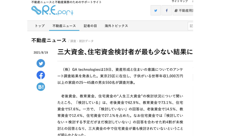 R.E. port|『三大資金、住宅資金検討者が最も少ない結果に』