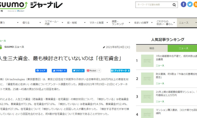 SUUMOジャーナルにて、当社が運営する不動産テック総合サービス「RENOSY」が行った、東京23区在住で未就学の子供がいる世帯年収1,000万円以上の家庭における「資産形成と住まい」の意識調査について取り上げていただきました。