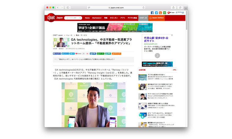 CNET(18.02.21) | GA technologies、中古不動産一気通貫プラットホーム提供--「不動産業界のアマゾンに」