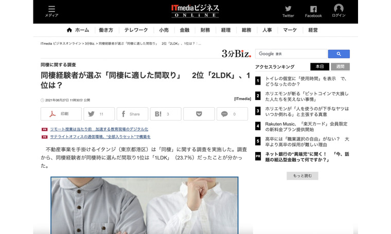 【掲載情報】(2021.08.27)ITmediaビジネスオンラインにて、当社のグループ会社であるイタンジ株式会社が実施した、同棲に関する意識調査第二弾について取り上げていただきました。