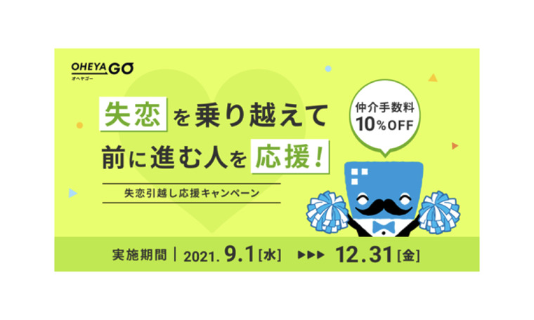 当社のグループ会社で、テクノロジーで不動産の賃貸取引をなめらかにするイタンジ株式会社が運営する、セルフ内見型賃貸サイト「OHEYAGO(オヘヤゴー)」( https://oheyago.jp/ )は、失恋をきっかけにお部屋探し・お引越しをされる人を対象に、転居先賃貸物件の仲介手数料が10%OFFになる「失恋引越し応援キャンペーン」を開始いたします。