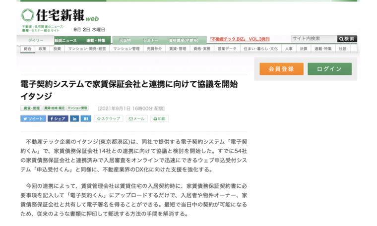 住宅新報にて、当社のグループ会社であるイタンジ株式会社が提供する不動産関連電子契約システム「電子契約くん」が、 家賃債務保証サービスを提供する保証会社14社との連携に向け協議・検討を開始したことについて取り上げていただきました。