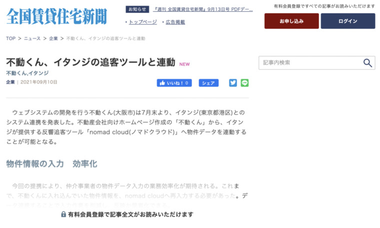 全国賃貸住宅新聞にて、当社のグループ会社であるイタンジ株式会社が提供する賃貸顧客管理システム「nomad cloud(ノマドクラウド)」と、ウェブシステムの開発を行う不動くん(大阪市)がシステム連携することについて取り上げていただきました。