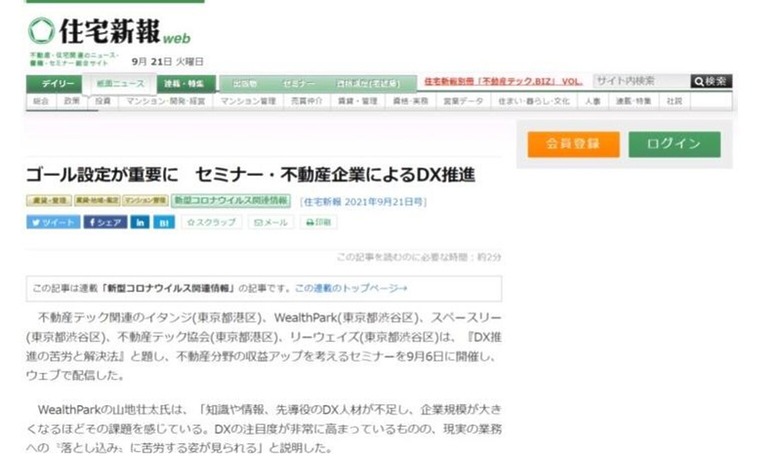 【掲載情報】 (2021.09.21)住宅新報にて、当社のグループ会社であるイタンジ株式会社の執行役員、増田 直大が登壇した「DX推進の苦労と解決法」に関するセミナーについて取り上げていただきました。