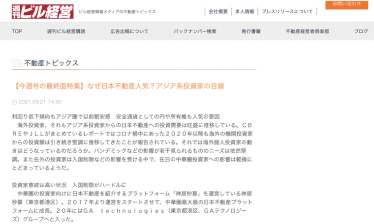 週刊ビル経営にて、当社のグループ会社であり、中華圏の投資家と日本の不動産をマッチングするプラットフォームを運営する、株式会社神居秒算について取り上げていただきました。