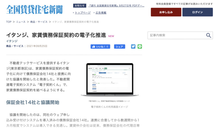 全国賃貸住宅新聞にて、当社のグループ会社であるイタンジ株式会社が提供する不動産関連電子契約システム「電子契約くん」が、 家賃債務保証サービスを提供する保証会社14社との連携に向け協議・検討を開始したことについて取り上げていただきました。