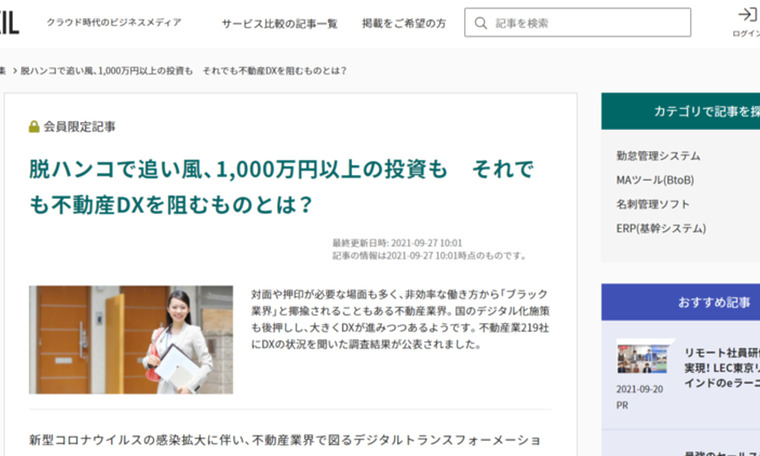 【掲載情報】 (2021.09.27) BOXILマガジンにて、当社のグループ会社であるイタンジ株式会社が行った、 「不動産業界におけるDX 推進状況 」に関するアンケート結果について取り上げていただきました。