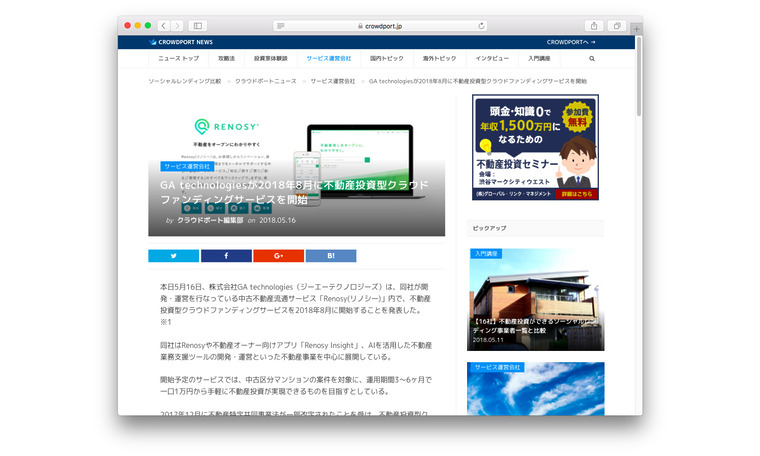 ソーシャルレンディング情報サイトのCROWDPORT NEWSにて、Renosyでのクラウドファンディングサービス(開始予定)をご紹介いただきました。