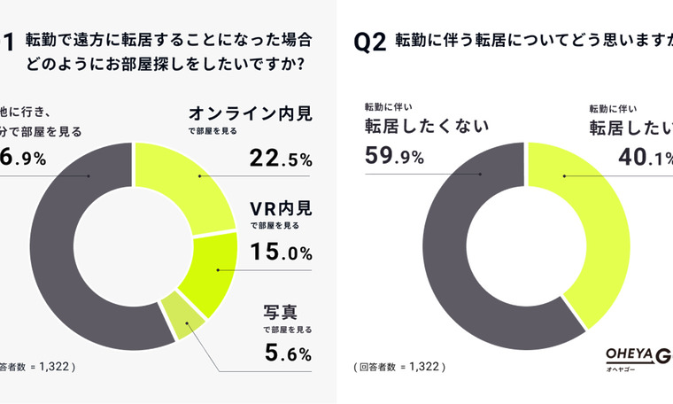 当社のグループ会社である、テクノロジーで不動産の賃貸取引をなめらかにするイタンジ株式会社(本社:東京都港区、代表取締役:野口 真平)は、この度スマートフォン上でお部屋探し、内見予約、入居申込みまでが完結する、セルフ内見型賃貸サイト「OHEYAGO(オヘヤゴー)」(https://oheyago.jp/)のTwitterアカウントのフォロワー1,322人に対し実施した、転勤・転居に関する意識調査の結果を発表します。