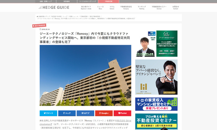 【掲載情報】 | HEDGE GUIDE(2018.05.18)不動産特定共同事業法改定など今回のサービス開始の背景を交えて、丁寧にご紹介いただきました。