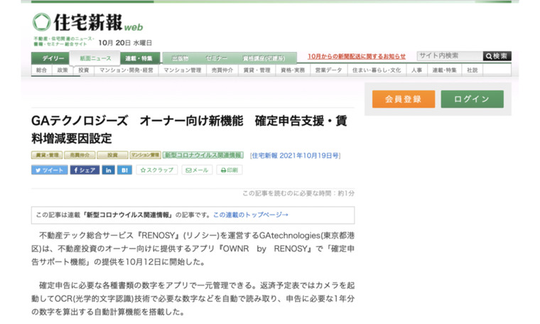 住宅新報にて、当社が運営する不動産テック総合サービス「RENOSY」の不動産投資で、オーナー向けに提供しているアプリ「OWNR by RENOSY」にて、「確定申告サポート機能」の提供を開始したことについて取り上げていただきました。