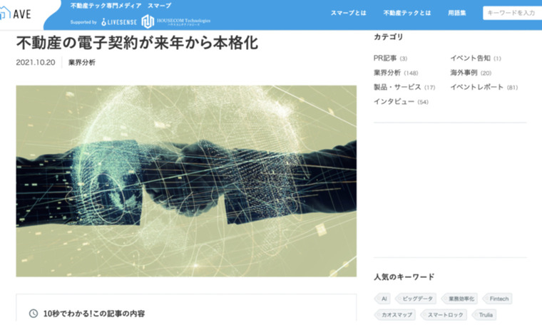 SUMAVEにて、当社のグループ会社であるイタンジ株式会社が行った「賃貸借契約における電子契約の利用意向についてアンケート」について取り上げていただきました。