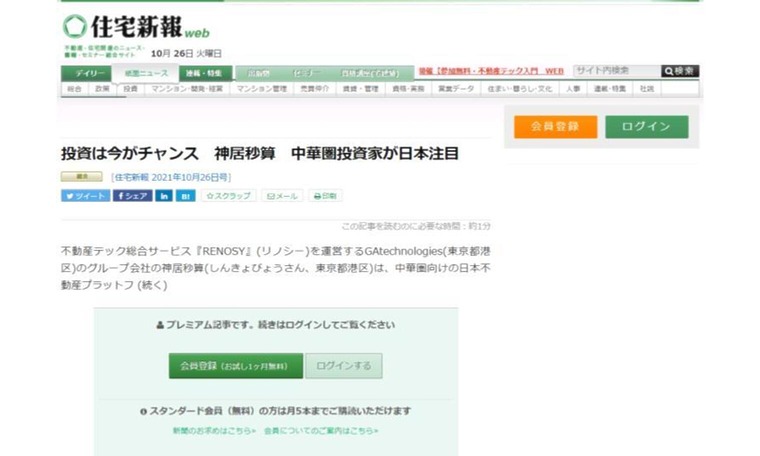 【掲載情報】 (2021.10.26)住宅新報にて、 当社のグループ会社である株式会社神居秒算が中華圏の投資家に向け実施した「コロナ後の不動産投資と海外旅行」に関する調査について取り上げていただきました。