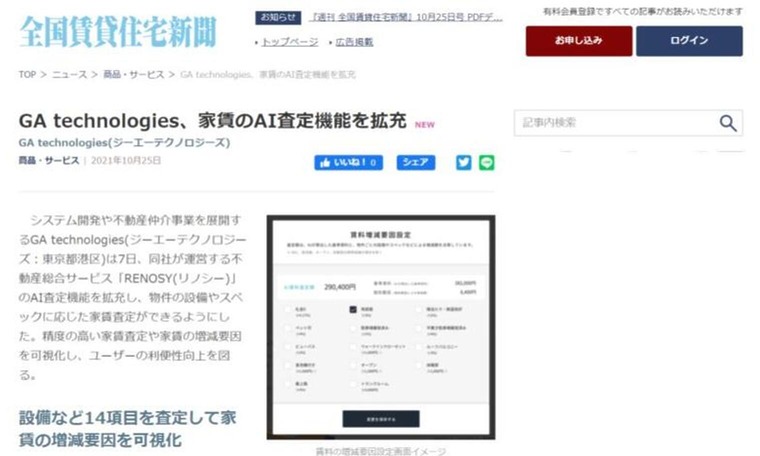 【掲載情報】 (2021.10.25)全国賃貸住宅新聞にて、当社が運営する不動産テック総合サービス「RENOSY」が不動産オーナーに向けマイページ上で提供しているAI査定機能をアップデートしたことについて取り上げていただきました。