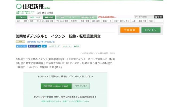 【掲載情報】(2021.10.26)住宅新報にて、 当社のグループ会社であるイタンジ株式会社が行った「転勤・転居に関する意識調査」について取り上げていただきました。