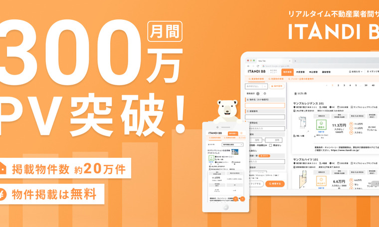 当社のグループ会社である、テクノロジーで不動産の賃貸取引をなめらかにするイタンジ株式会社が提供する、リアルタイム不動産業者間サイト「ITANDI BB(イタンジ ビービー)」( https://lp.itandibb.com/ )は、2021年11月度、賃貸不動産仲介会社からのアクセスが月間300万PVを突破し、掲載物件数は約200,000件となりました。