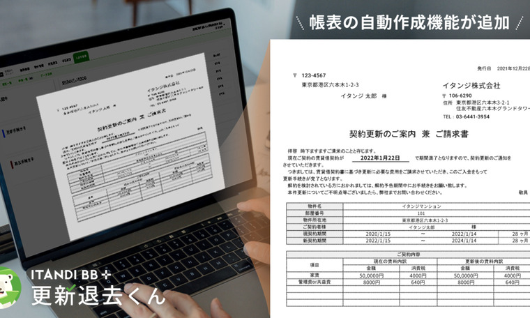 当社のグループ会社である、テクノロジーで不動産の賃貸取引をなめらかにするイタンジ株式会社が提供する、賃貸住宅のWEB更新・退去システム「更新退去くん」(https://lp.itandibb.com/koushin-taikyo/)において、帳票作成機能のご利用が可能になったことをお知らせします。