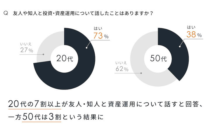 ・ 20代の7割以上が友人・知人と資産運用について話すと回答、一方、50代は3割という結果に