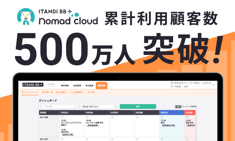 当社のグループ会社である、テクノロジーで不動産の賃貸取引をなめらかにするイタンジ株式会社は、 2022年1月、賃貸不動産仲介会社(以下「仲介会社」)向け顧客管理・自動物件提案システム「ノマドクラウド(https://lp.itandibb.com/crm/) 」の累計利用者(エンドユーザー)数が500万人を突破したことをお知らせします。