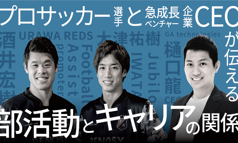 現役サッカー選手として活躍する大津祐樹(ジュビロ磐田)・酒井宏樹(浦和レッズ)と、ジェフユナイテッド市原の育成選手としてプロサッカー選手を目指した経験のある樋口 龍(GAテクノロジーズ代表)。