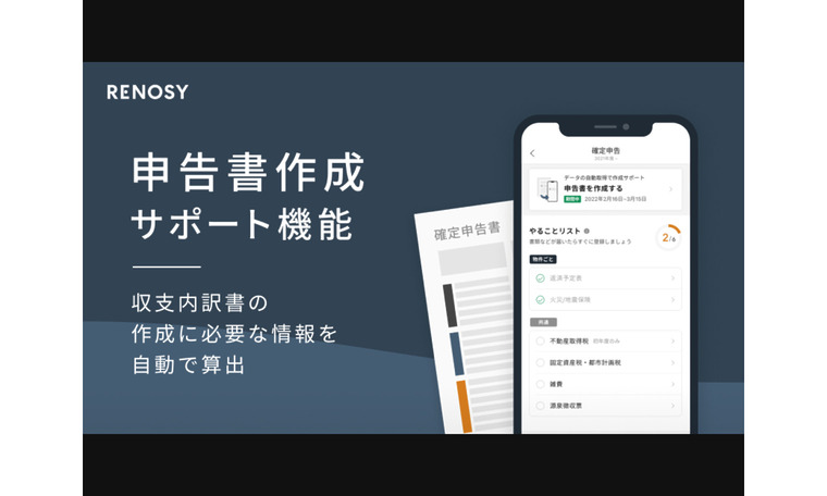 オンライン不動産取引マーケットプレイス「RENOSY(リノシー)」を運営する当社は、RENOSYで物件を購入いただいたお客様向けに提供している資産管理アプリ「OWNR by RENOSY(オーナー バイ リノシー)」にて、収支内訳書の作成に必要な情報を自動で算出する「申告書作成サポート機能」の提供を開始しました(※1)。