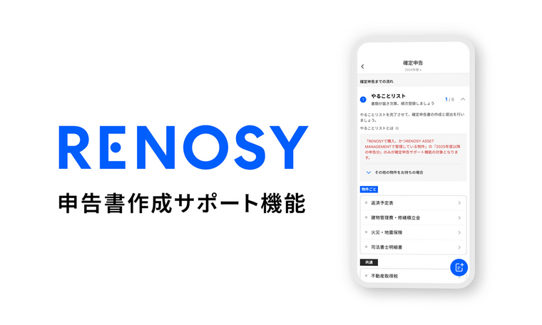 オンライン不動産取引マーケットプレイス「RENOSY(リノシー)」を運営する当社は、RENOSYで物件を購入いただいたお客様向けに提供している資産管理アプリ「OWNR by RENOSY(オーナー バイ リノシー)」にて、収支内訳書の作成に必要な情報を自動で算出する「申告書作成サポート機能」の提供を開始しました(※1)。