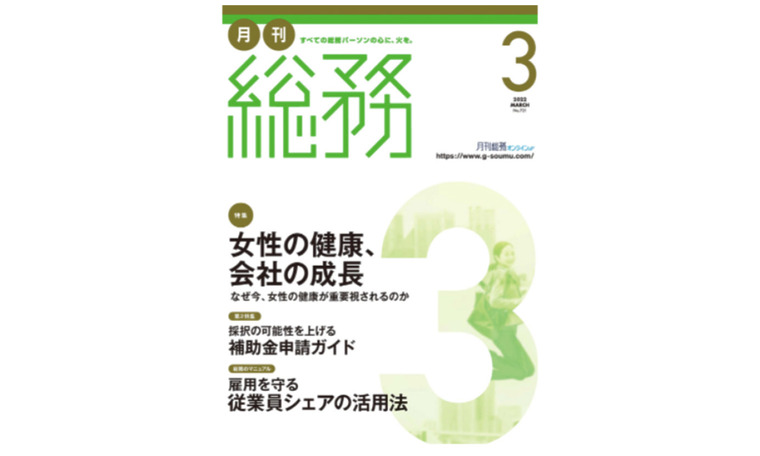 【メディア掲載】(2022.2.8)月刊総務 3月号の「女性の健康、会社の成長」特集 企業事例にて、当社の総務・労務部シニアマネージャー 奈良 諭志と、労務部チーフ 橋本 瑞希のインタビューを掲載いただきました。