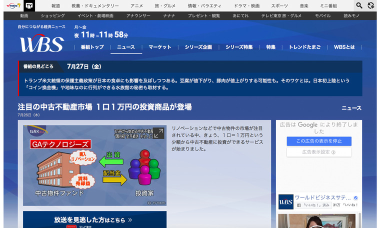 7月26日(昨日)放送のテレビ東京「WBS | ワールドビジネスサテライト」にて、7月26日にサービスを開始した当社の「Renosyクラウドファンディング」を「注目の中古不動産市場 1口1万円の投資商品が登場」としてご紹介いただきました。