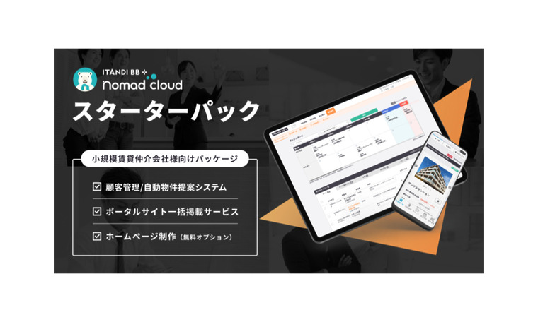 当社のグループ会社である、テクノロジーで不動産の賃貸取引をなめらかにするイタンジ株式会社は、 2022年3月、不動産事業会社の85%以上(※1)を占める少人数企業を対象に、顧客管理・自動物件提案システム、ポータルサイト一括掲載サービス、ホームページ制作(無料オプション)をパッケージ化した「ノマドクラウド スターターパック(https://lp.itandi.co.jp/nomad-cloud-starter-pack01)」の提供を開始いたします。