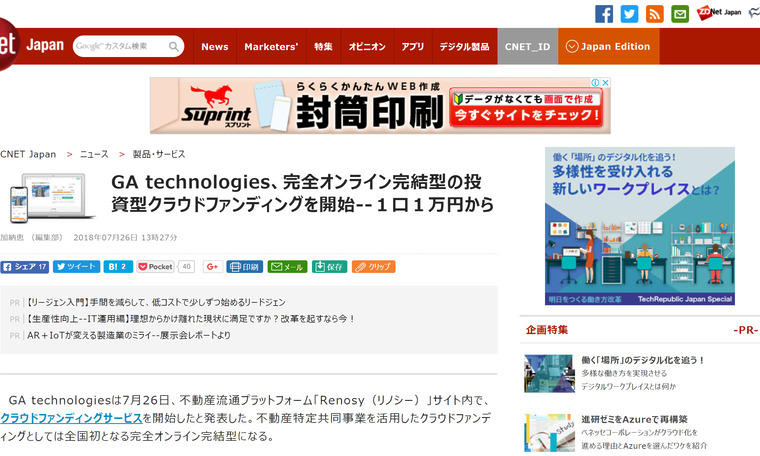 CNET Japanに、当社のクラウドファンディング事業を掲載していただきました。