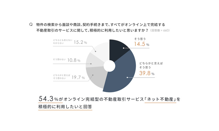 調査結果から全体の43.9%がこれまでの不動産取引経験について「不満があった」と回答し、不動産業界のイメージに対しては、「アナログだと思う」と回答した人が56.1%と約6割を占める結果になりました。一方、インターネットの普及からか、不動産業界へのオンライン化に対する期待も高く、54.3%の人が「オンライン完結型の不動産取引サービスを積極的に利用したい」と回答し、今後オンライン完結型の不動産取引サービス、「ネット不動産」に期待していることが判明しました。