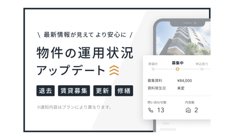 本アップデートでは、入居者情報や毎月の収支などを表示している「物件の運用状況ページ」を拡充し、入居申込みや退去の申し出、設備の交換状況など、従来メールのみでお送りしていた所有物件に関する全てのお知らせを、アプリでもご確認いただけるようにしました(※3)。