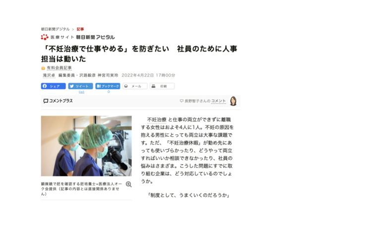 朝日新聞|「不妊治療で仕事やめる」を防ぎたい 社員のために人事担当は動いた