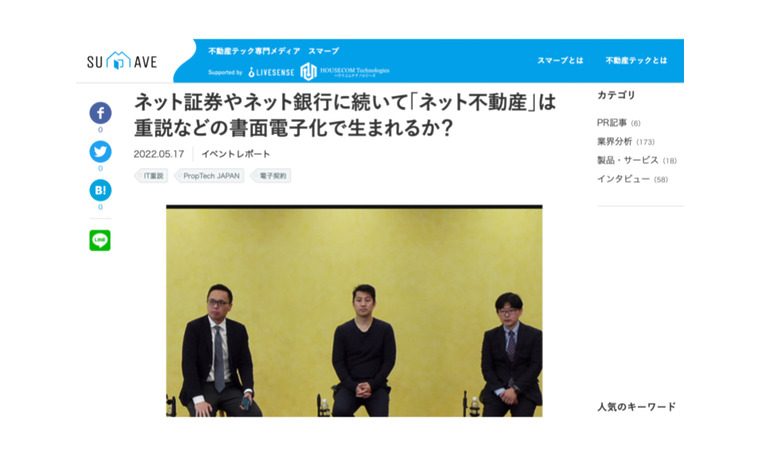 SUMAVEにて、デジタルベースキャピタル 代表パートナーの桜井 駿氏がモデレーターとなり、東京大学大学院経済学研究科特任教授 不動産イノベーション研究センター(CREI)の武藤 祥郎氏と、当社の代表取締役社長執行役員CEOの樋口 龍と、執行役員CCOの川村 佳央が登壇したオンラインイベント「政府デジタル推進によりネット不動産時代が到来、オンライン完結型の不動産取引の現状と未来とは」についてご紹介いただきました。
