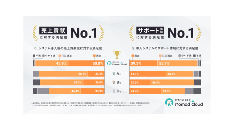 当社のグループ会社である、テクノロジーで不動産の賃貸取引をなめらかにするイタンジ株式会社 は、賃貸顧客管理・自動物件提案システム「ノマドクラウド」が、賃貸仲介業者のDX関連調査にて「売上貢献」と「サポート体制」の2部門で満足度No.1を獲得(※1)したことをお知らせいたします。