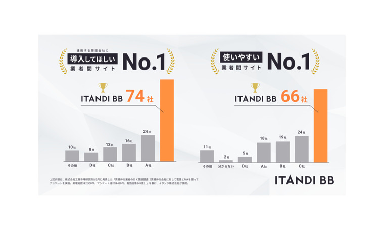 当社のグループ会社である、テクノロジーで不動産の賃貸取引をなめらかにするイタンジ株式会社は 、 リアルタイム不動産業者間サイト「ITANDI BB(イタンジ ビービー)」が、賃貸仲介業者のDX関連調査にて「管理会社に導入して欲しい不動産業者間サイト」 「使いやすい不動産業者間サイト」の2部門でNo.1を獲得(※1)したことをお知らせいたします。