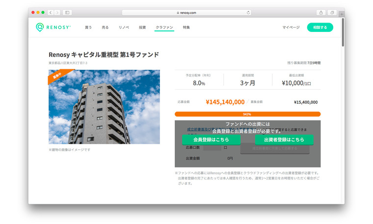 当社は、8月2日(木)18:00より、Renosyサイト内で不動産特定共同事業を活用したRenosyクラウドファンディングの第1号案件の募集を開始いたしました。募集開始後約5分で予定募集口数(1,540口)を達成し、現在942%(2018年8月6日12:00時点)を記録しております。なお、Renosyのクラウドファンディングは抽選方式を採用しているため、8月13日21:00まで応募を受付けております。